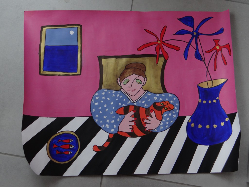 Les formats grandissent : toujours de l’acrylique mais cette peinture , comme les 2 précédentes (je crois ) taille 65 cm par 50 cm . Je n’en suis pas encore au mur, mais ça se développe dans ce sens 😉 La peinture sur grain de riz n’est pas dans ma nature.