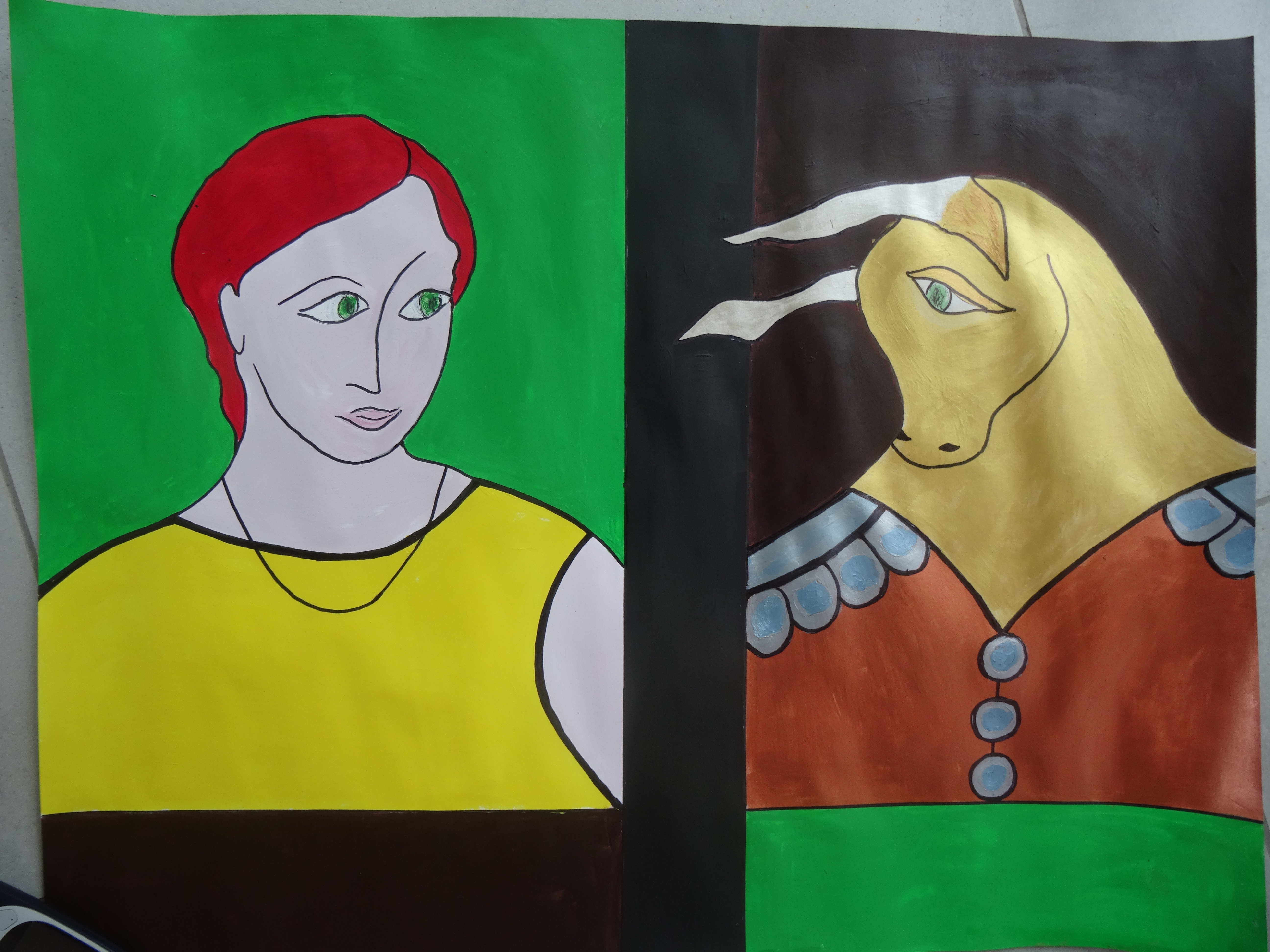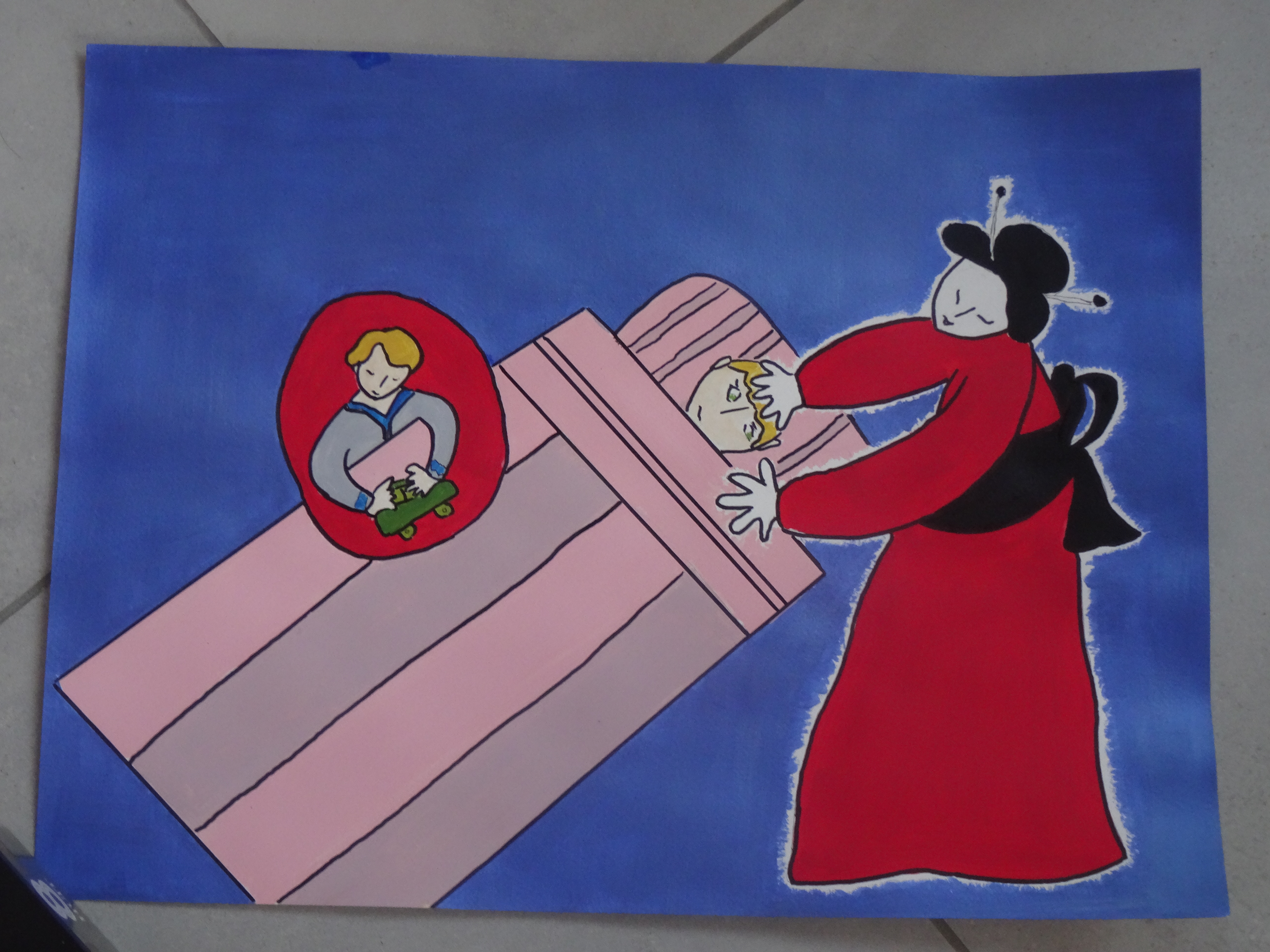Je ne sais pas pourquoi la Certa est ‘sortie‘ – il n’y a pas d’autre mot – en geisha japonaise . Toujours est-il que j’ai appelé cette peinture, après l’avoir peinte, La Certa car ce mot italien pour la mort, rencontré cet été en lisant l’Arte de la Gioia de Goliarda Sapienza, m’avait frappée. J’avais rêvassé aux implications, comparé avec notre image française de Faucheuse. Je m’étais dit que sur ce point les Anglais avaient le même imaginaire que nous avec The Reaper. Et puis voilà ! Ma connaissance des langues n’allant pas plus loin, je m’étais arrêtée là.