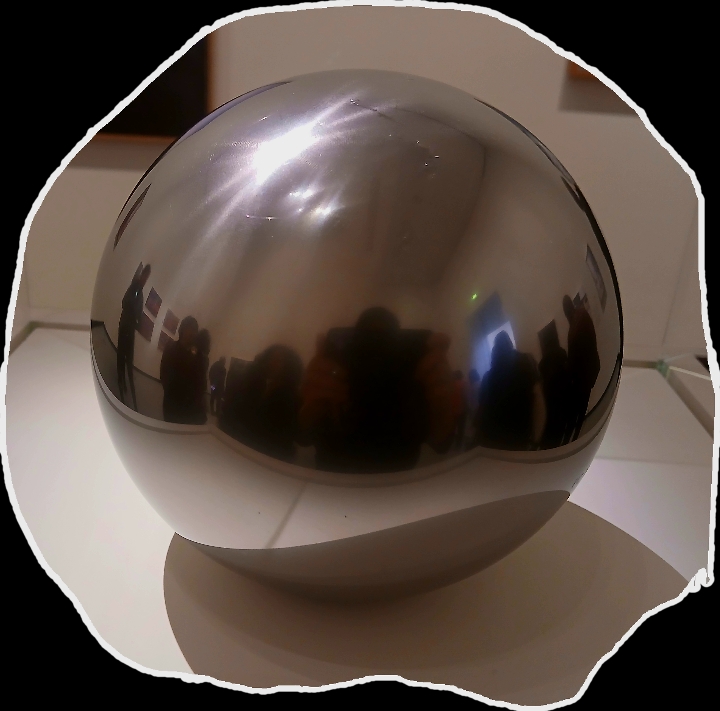 Bien remuée (moved) par Richter, j’y suis allée de mon escalade à moi : cet ‘Autoportrait au smartphone’, qui est mon reflet dans une sphère d’acier (une bille d’un roulement à billes si je me souviens bien ) exposée dans une des salles. C’est ma réponse ‘à la Richter’ : Qui suis-je pour moi ? qui suis-je pour mes contemporains ? qui serai-je pour mes descendants ? et au finish bien sûr, est-il nécessaire de fariboler sur cette ombre noire illisible ?