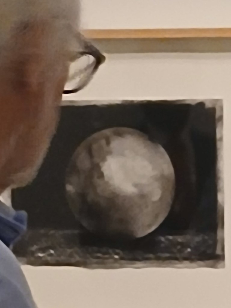 C’est pour cela que je suis contente du hasard (mais le hasard existe-t-il ?? 😉 ) qui m’a fait prendre cette photo floue d’un ‘gênant’ regardant une sphère dessinée par Richter que je voulais photographier. C’est la cerise sur le gâteau 😉 Il n’y a même pas de silhouette dans la sphère qu’il regarde 😉 Est-ce un descendant lointain que j’aurais croisé dans cette exposition ?? 😉